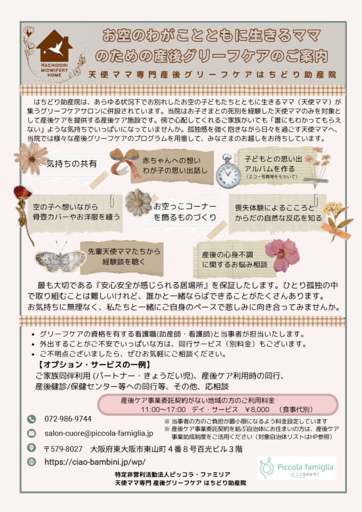 体調面のご心配があれば、流産や死産を経験した当事者、又はグリーフケアの資格を有する助産師や看護師がサポートしますので、安心してお越しくださいませ。