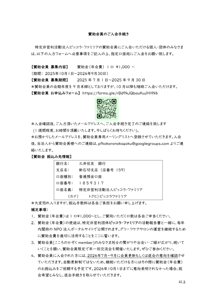 ピッコラ・ファミリアの活動に賛同し、応援してくださる個人・団体を賛助会員 [ こころのかぞくmember]とさせていただきたいと思います。