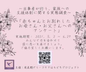 周産期医療に関わる多職種(医師、助産師、看護師、保健師、臨床心理士、ケースワーカー、遺伝カウンセラー、セラピスト、保育士など)が精神保健の重要性を理解し、連携と協働を通じて赤ちゃんと家族を支える支援の在り方を研究し、実践することを目的とされる研究会に当事者の声を届ける機会をいただきましたので、当事者の想いをしっかりと伝えたいと思います。
